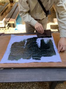 3、色糊を塗って蒸す(扱き染めから蒸し)作業 *15分