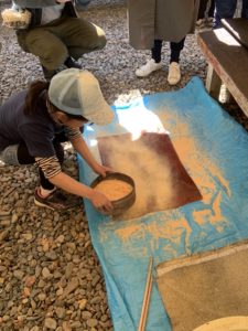 2、伊勢型紙を使っての柄付け(白描)作業   *10分